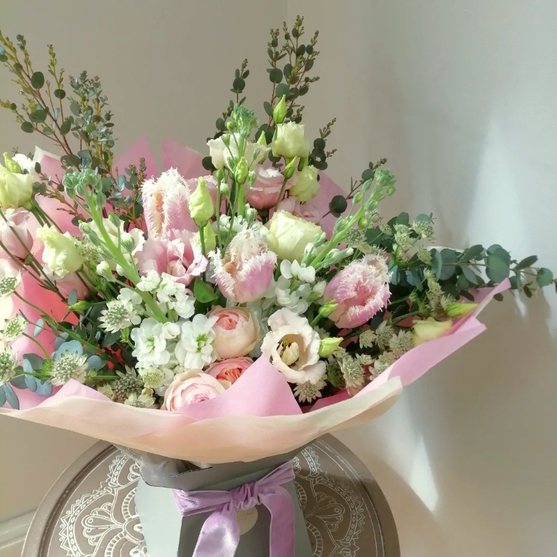 Softest pink and white florals for your sweetheart. All wrapped up in gorgeous tissue papers and boxed in water. Finished with a beautiful fabric ribbon.